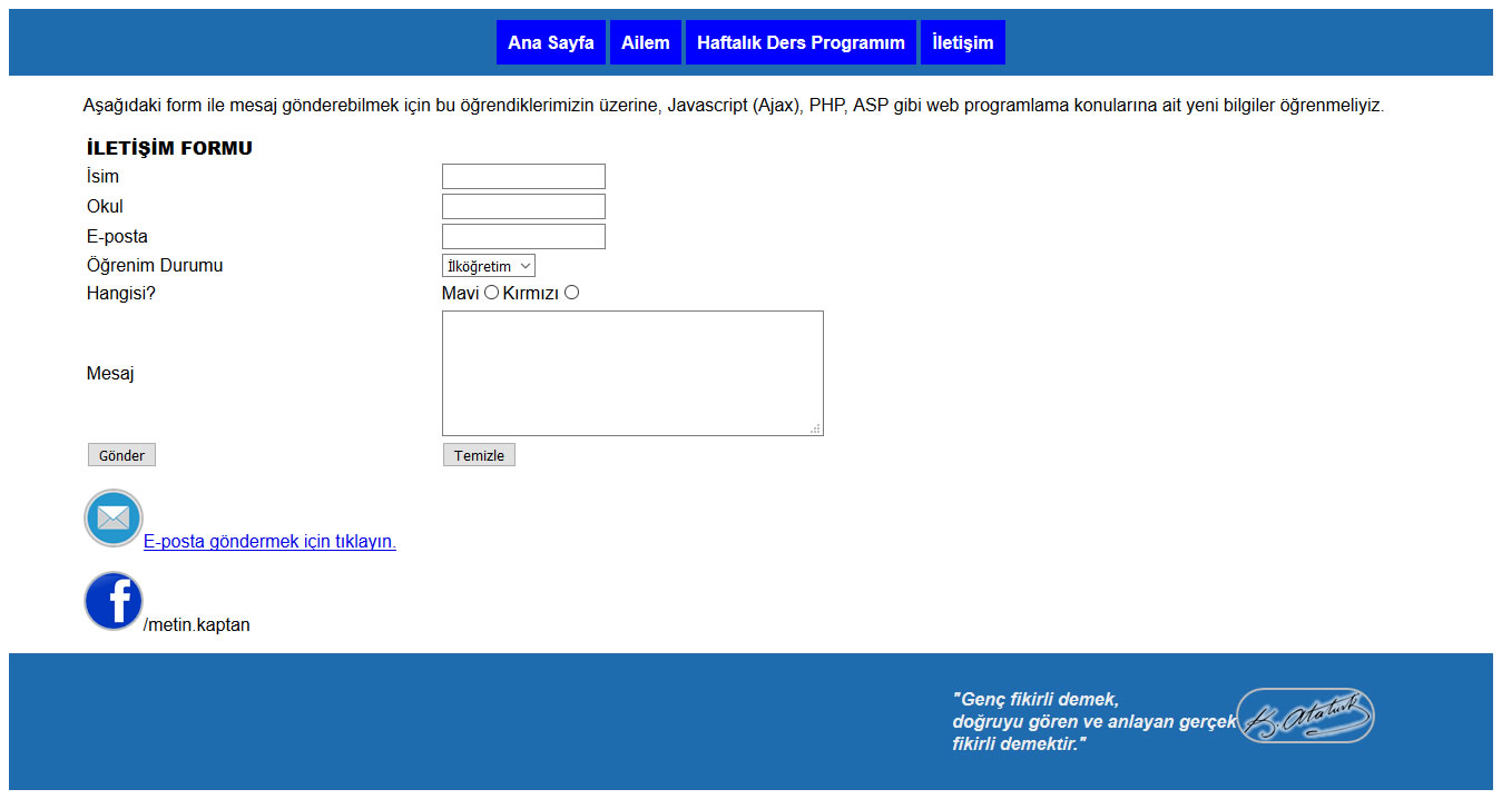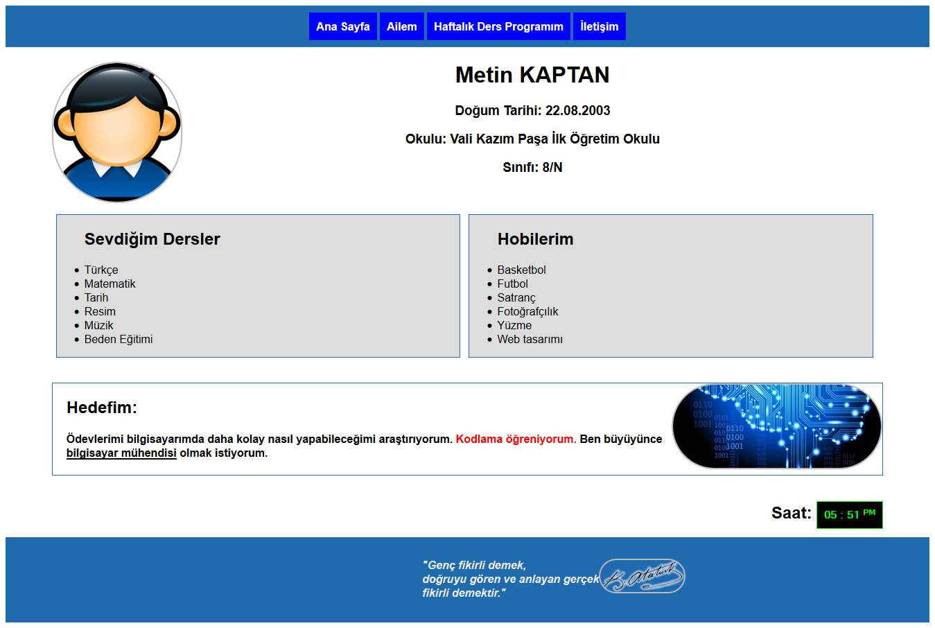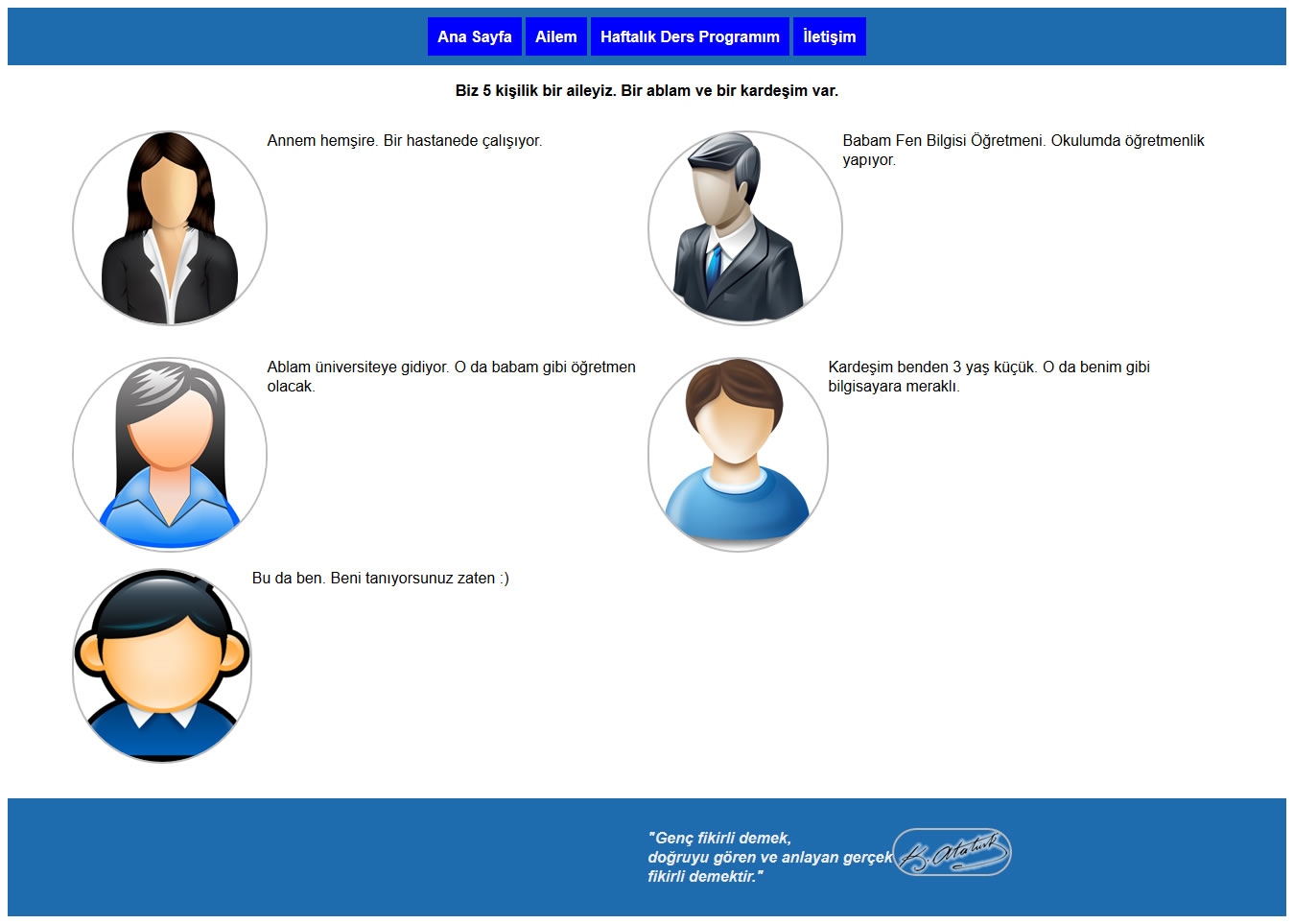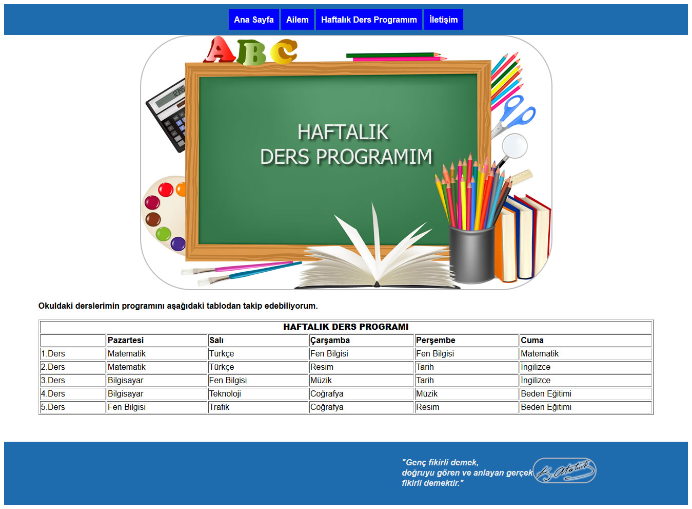 index.html sayfasına baktığımızda en üstte bir menü, altında sayfanın soluna dayalı bir fotoğraf, fotoğrafın sağında kişisel bilgiler bulunduğunu görüyoruz. Bir alt alanda sevdiğim dersler ve hobilerim alanları bulunuyor. Bu alanların altında hedefim alanı ve en alt bölümde de sağdan sola doğru kayan yazı şeklinde Atatürk’ün bir sözünün geçtiğini görüyoruz.
